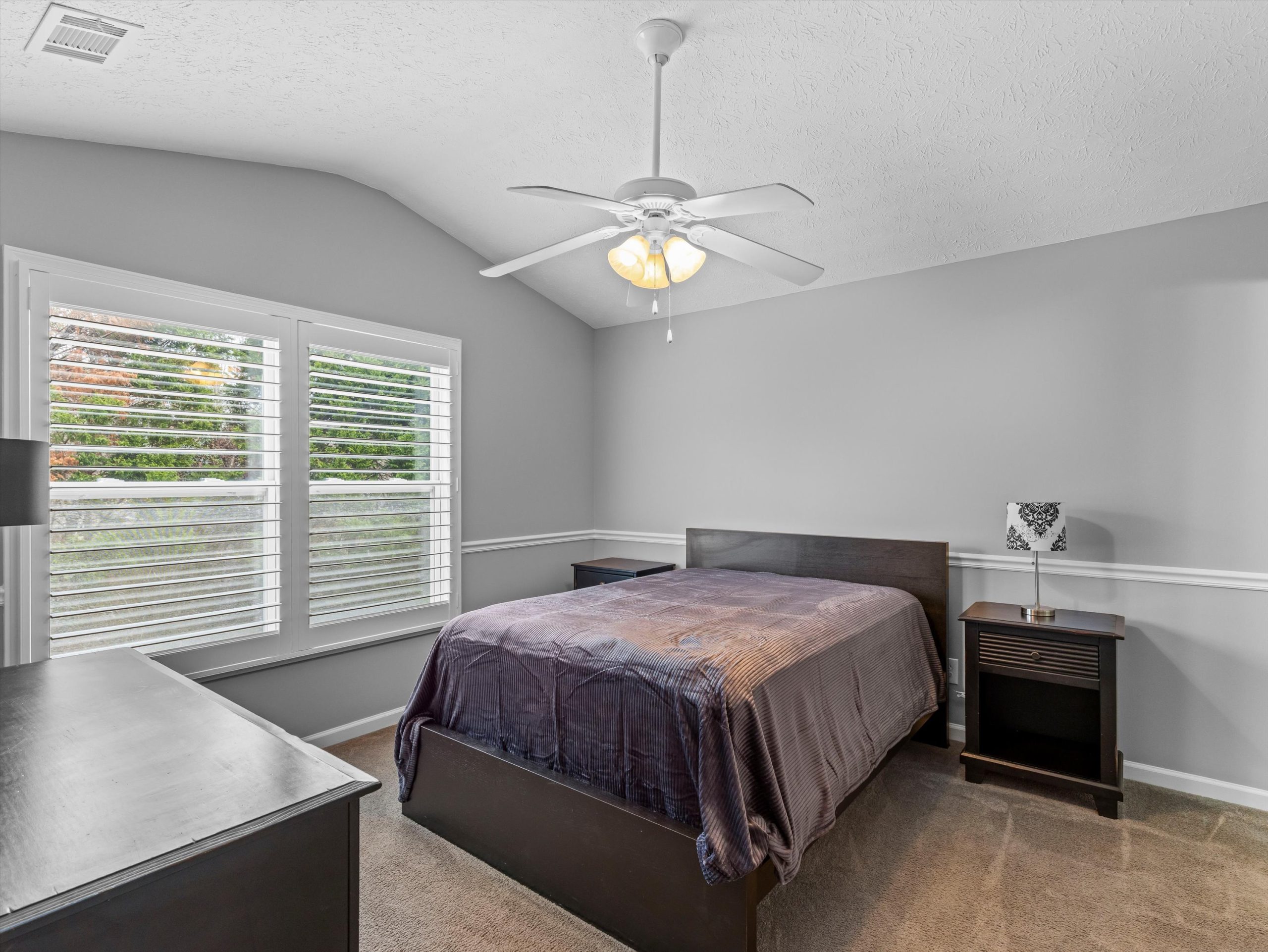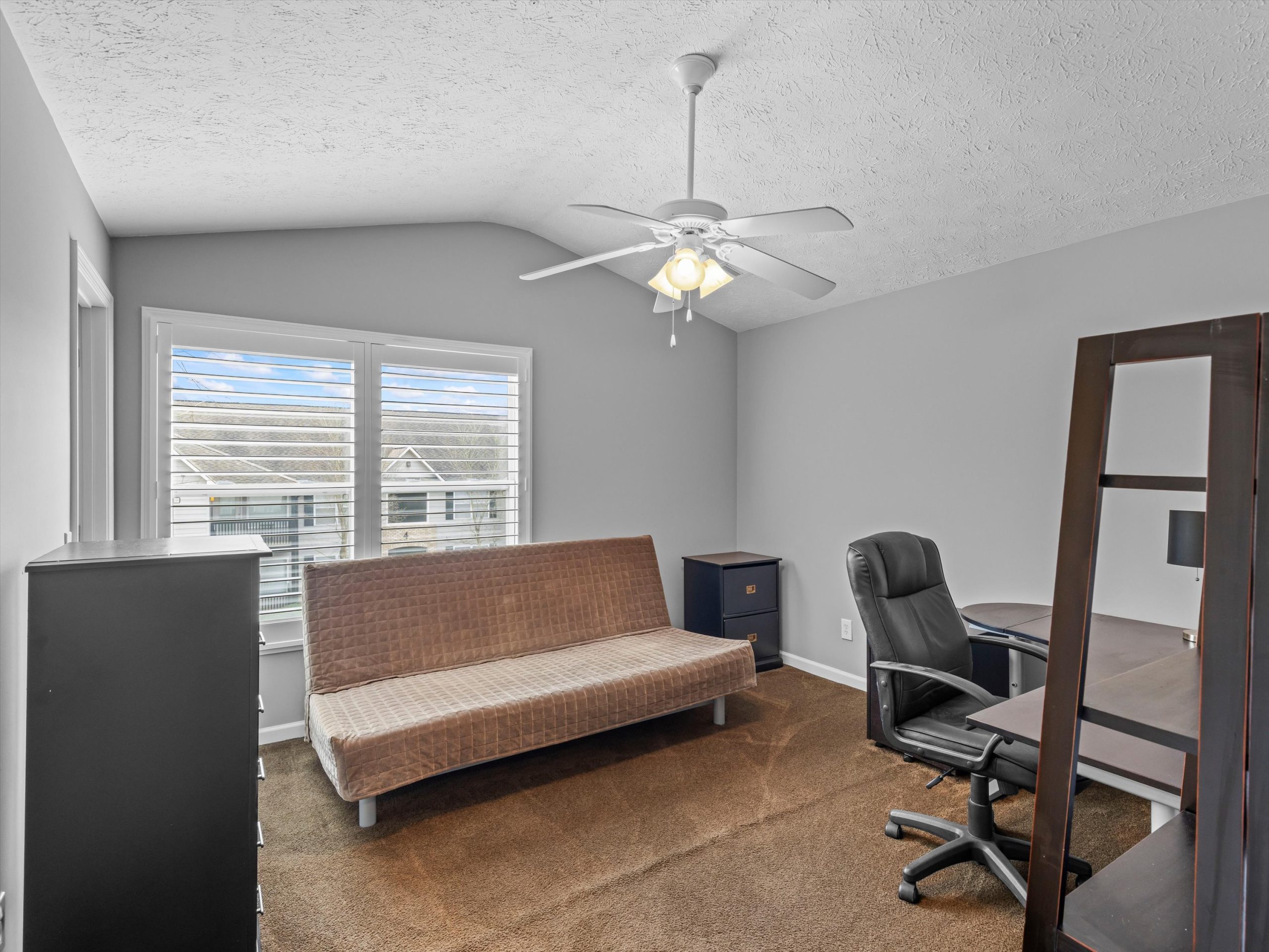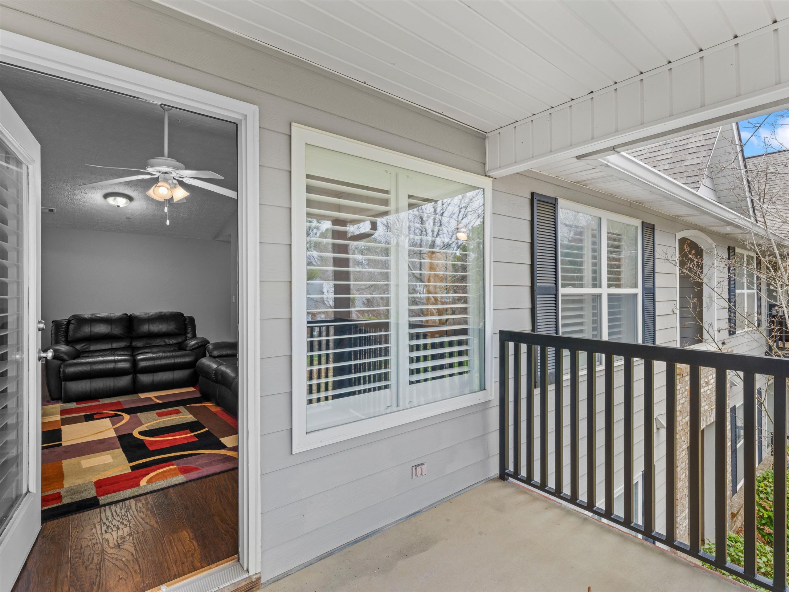 The living area features vaulted ceilings, abundant natural light, and direct access to a private covered balcony overlooking peaceful green space. Plantation shutters throughout the condo provide timeless style while enhancing privacy and natural light control. The open kitchen offers ample cabinet storage, generous counter space, and a breakfast bar that flows seamlessly into the dining and living areas, creating an ideal space for both everyday living and entertaining.